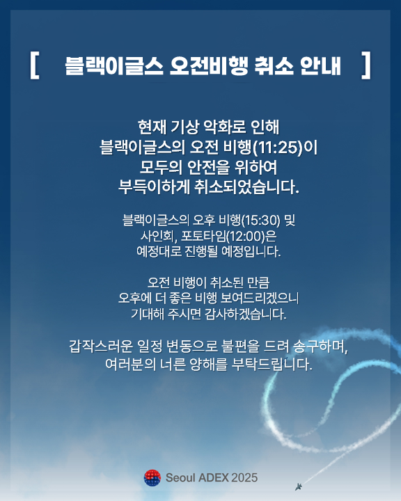 서울 ADEX 2025 10. 18.(토) 블랙이글스 오전비행 취소 안내 2025-10-18